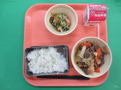 今日の献立は、熊野江小学校のリクエスト献立でした。ご飯、牛乳、宮崎牛のすき焼きに、梅の香和えです。