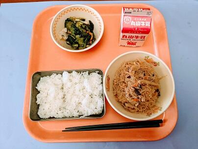 今日の献立は、ご飯、牛乳、麻婆春雨、ナムルです。