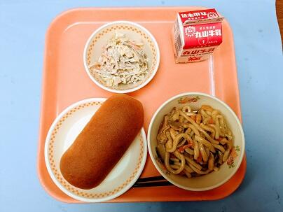 今日の献立は、げんりょうコッペパン、牛乳、しおやきそば、チーズサラダです。