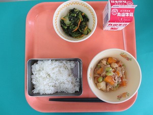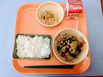 今日の献立は、ご飯、牛乳、大豆のいそ煮、白菜の酢の物です。大豆のいそ煮は、大豆、鶏肉、ゴボウ、こんにゃく、などいろいろなものが入っており、栄養のバランスがよく、とてもおいしかったです。白菜の酢の物は甘酢で子どもたちにも食べやすい味付けでさっぱりとしておいしかったです。