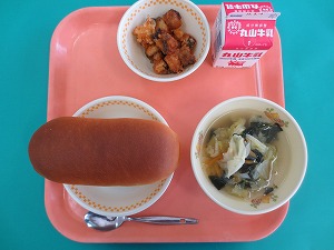 今日の献立は、ミルクパン、牛乳、とりにくのレモンあえ、コロコロやさいスープです。