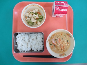 今日の献立は、ご飯、牛乳、とうふのごもくあんかけ、ツナサラダです。