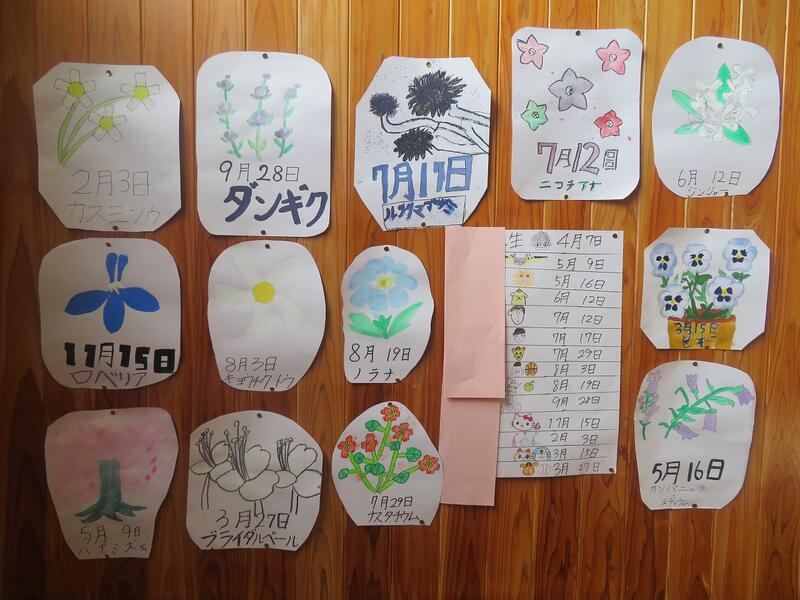 階段に6年生が図工の学習で調べ描いた花の絵が貼ってあります。6年生は自分の誕生花を調べ、それを描いたようです。いろんな花があるんですね。