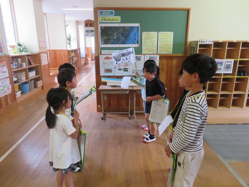 今日は1・2年生による学校探検でした。4つの班に分かれて、校内の15ヶ所の教室等を探検しました。どの班も2年生がしっかり誘導して、1年生に優しくその場所の説明等をしてくれました。