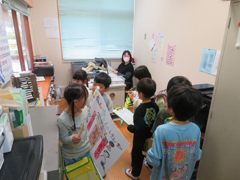 4月23日(木)、午前中にかわいいお客様が校長室に来られました。お客様は1年生でした。今、生活科の学習で「どんなせんせいがいるのかな」という学習をしています。それぞれが手作りの名刺を持参して、自己紹介をして「好きな食べ物は何ですか?」などの質問をしてくれました。自分のことを相手に知ってもらい、相手のことを知り、仲良くなることを目標にした学習です。1年生は今後も色々な先生方のところへ行くようです。