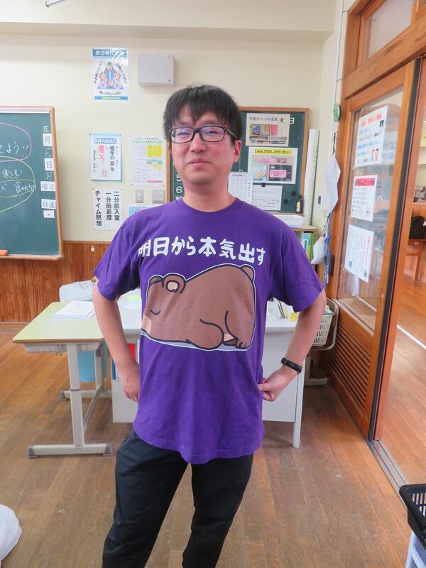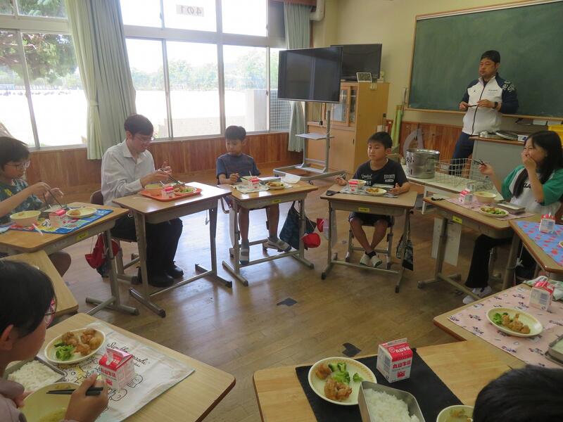 今日は水曜日、ALTの「ロブ」が学校に来て3年生以上の外国語活動・外国語科の指導に一緒に入られる日です。給食は4年生と英語で楽しく話しながら一緒に食べていました。箸の使い方も上手です。「カラアゲオイシイデ~ス」と言ってました。