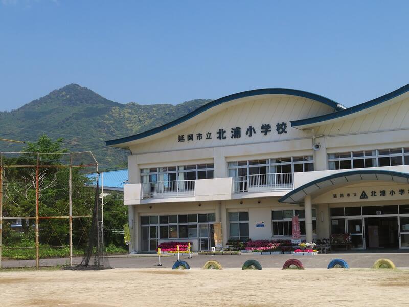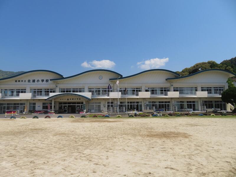 ↑ 運動場から見た北浦小学校の校舎です。海をイメージして作られているこの校舎はとてもきれいです。