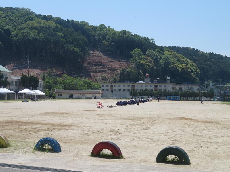 ↑ すぐ隣には北浦中学校があります。とても広い運動場は、小学校・中学校で一緒に使います。今日は体育祭に向けて中学生が綱引きをしていました。