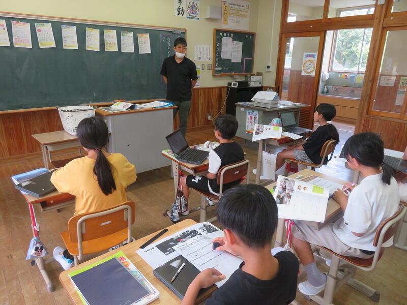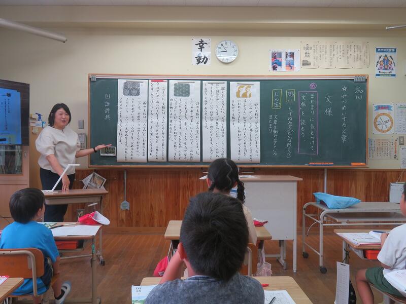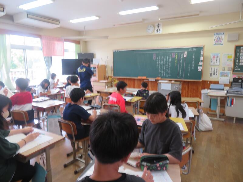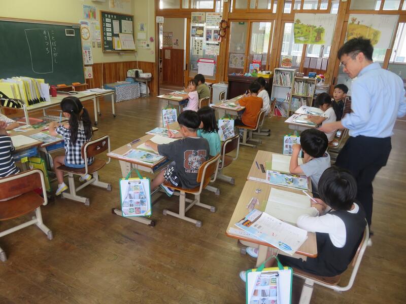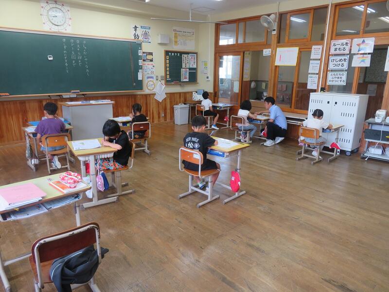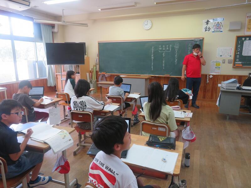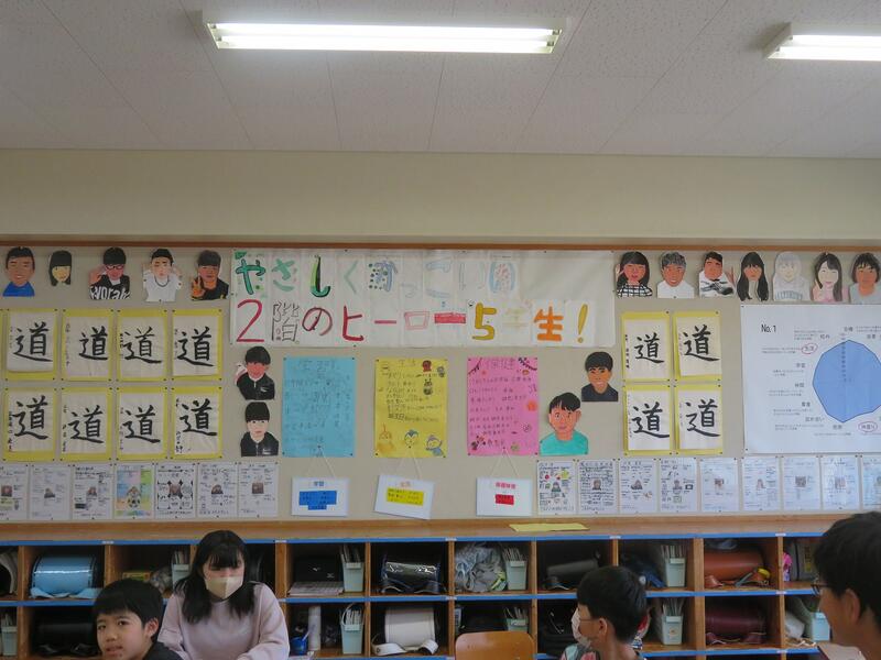 5年生の教室をのぞいてみました。背面黒板には児童の作品等がたくさん掲示してあります。真ん中に「やさしくかっこいい2階のヒーロー5年生!」とあります。5年生は1階教室の1~4年生のお手本になれるようにとこの学級目標にしています。そのとおり毎日しっかりした態度で過ごしています。これからもよろしくお願いしますね。