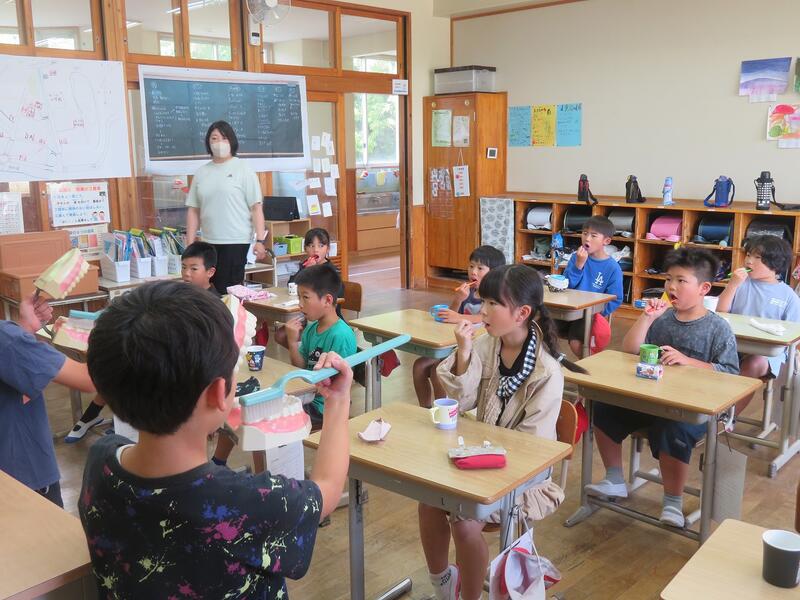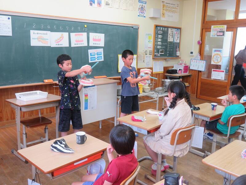 今週来週と養護教諭の指導のもと、保健体育委員会の児童が各学級をまわって、「歯みがき指導」を行っています。今日は3年生の教室です。丁寧な説明のあと、歯の模型を使って磨き方を教えてくれました。それを見ながら3年生も一緒に磨きます。歯を大切にしていきましょうね。