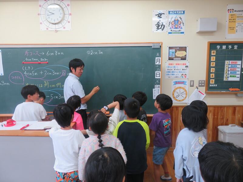 今日は2年生の算数の学習が楽しそうでした。担任は黒板に分かりやすく板書しています。それでも間違えやすい問題は、全員を黒板前に集めて丁寧に説明していました。