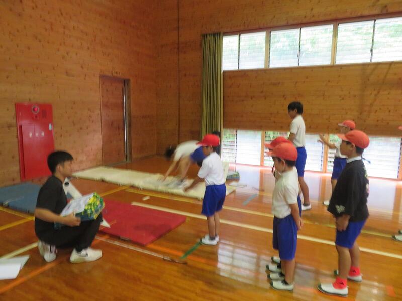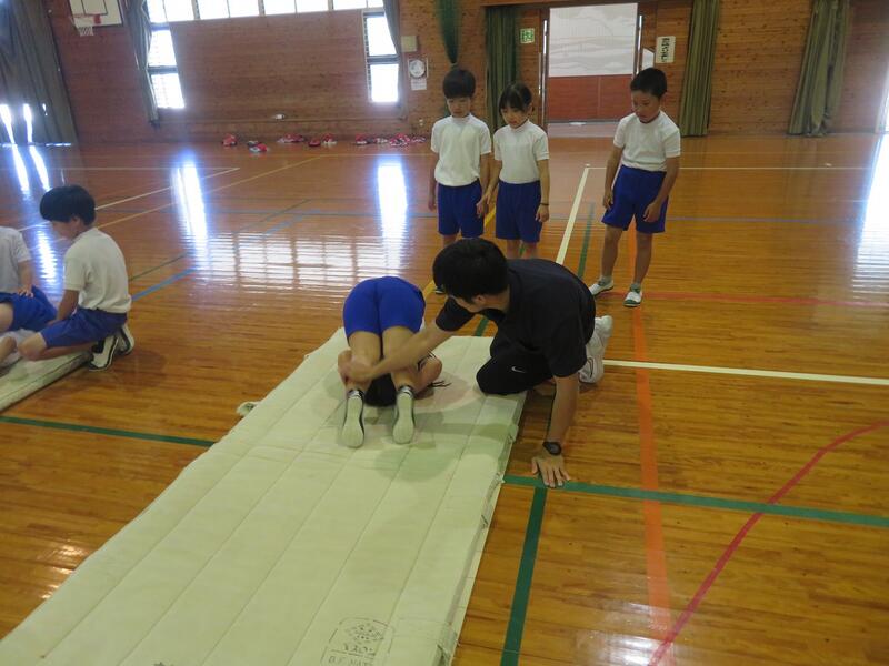 ↑2年生はマットを使った運動です。担任の補助で後ろ回りをしていました。