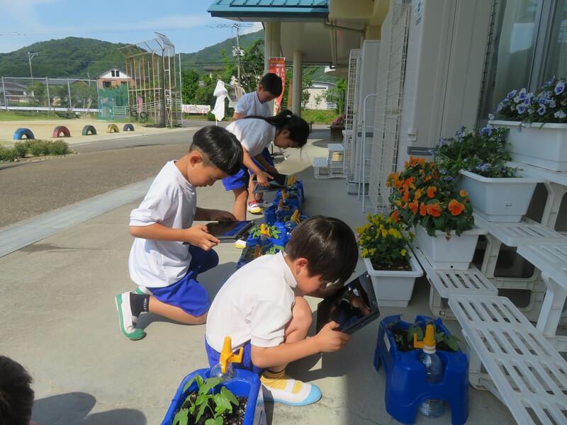 一人一端末の時代です。今日は1年生もタブレットを使って学習を進めていました。担任によるタブレットを使っての写真撮影方法を聞いた子ども達は、早速自分の育てているアサガオの写真を撮っていました。慣れると早いものですね。