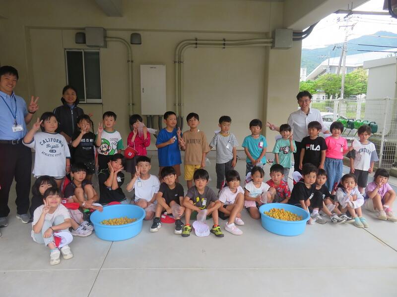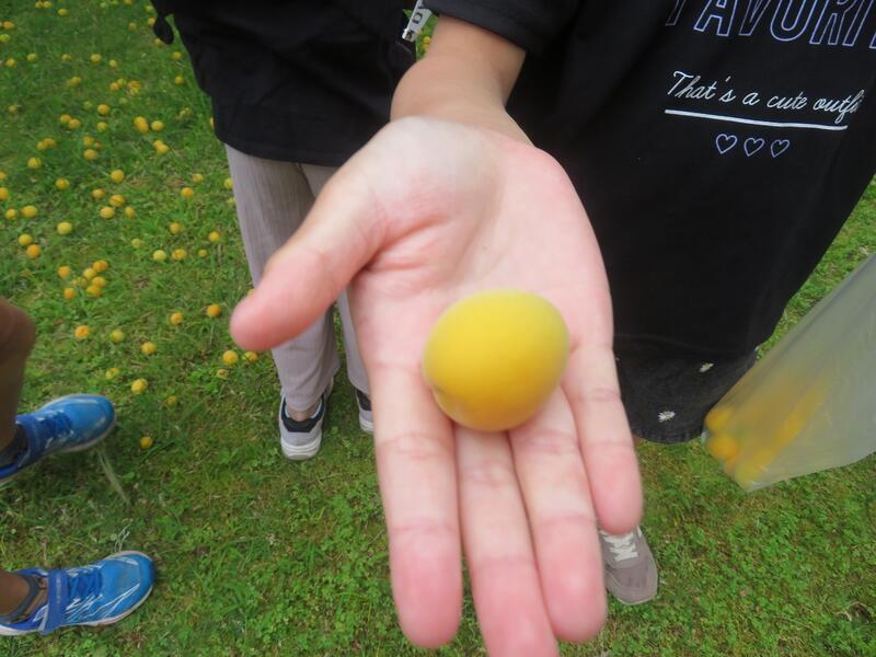 ↑たらい2つにたくさん収穫できました。今後は梅シロップを作っていく予定のようです。朝から素敵な笑顔がたくさん見られました。