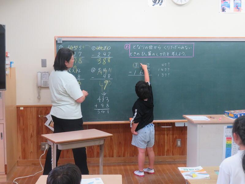 3年生は算数で引き算の筆算を学習していました。今日は繰り下がりが複雑な引き算でした。