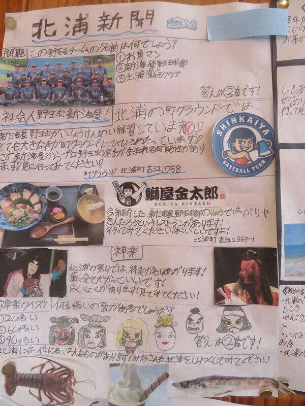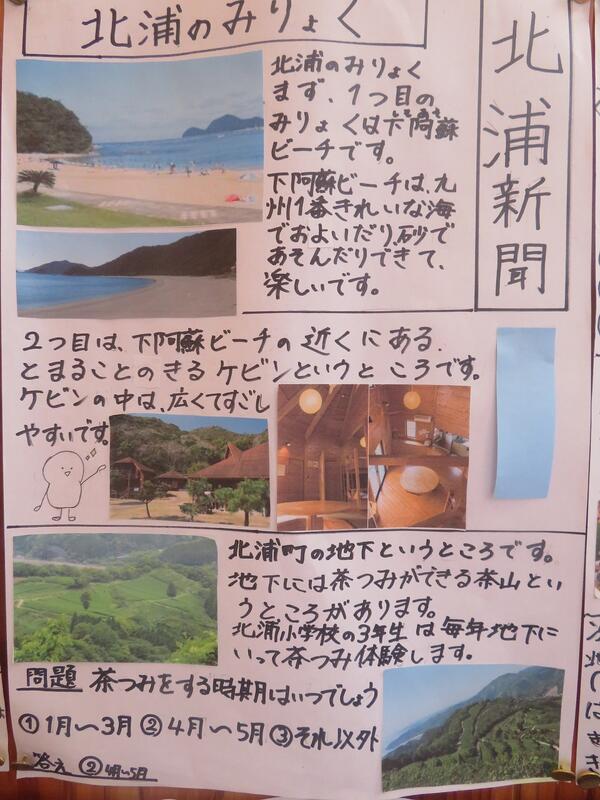 6年生は修学旅行先の大分市で、北浦町のPR活動を行います。そのPR活動に向けて、まずは自分たちの暮らす北浦を自分達が知ってまとめる学習を行いました。階段に掲示されている中の一部を紹介します。