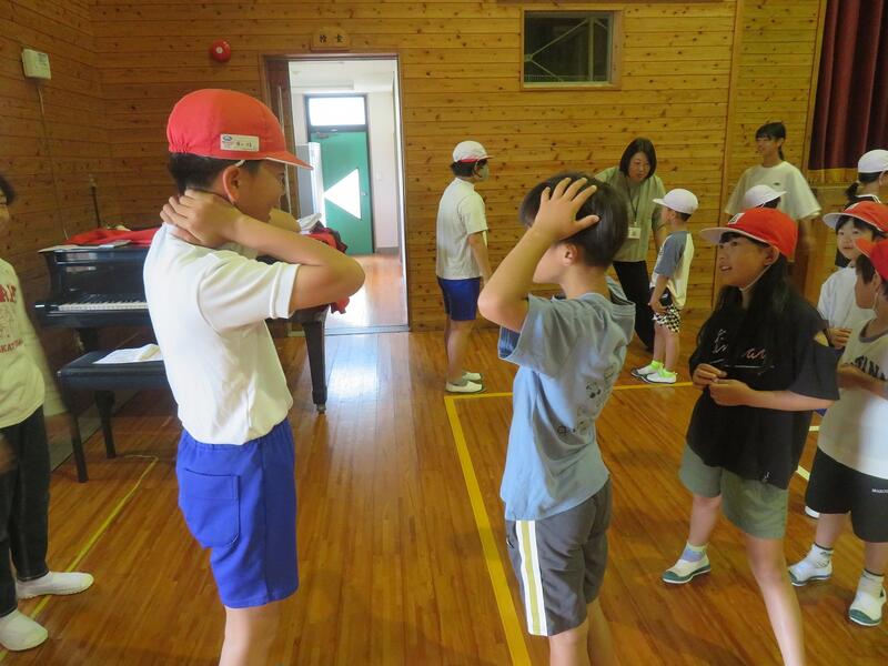 ↑「ジェスチャーゲーム」です。6年生の考えたお題をジャスチャーで班のメンバーに伝えます。