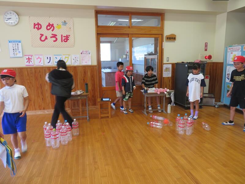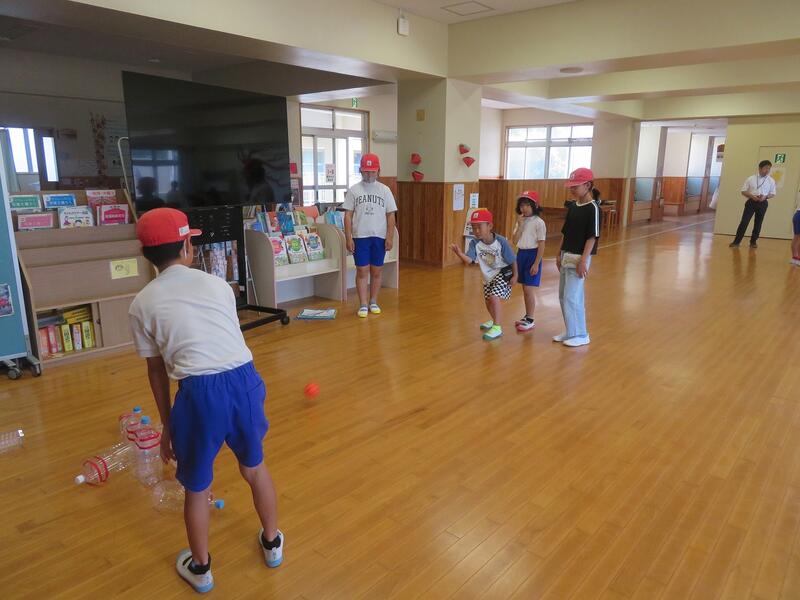 ↑「ボウリング」です。ペットボトルをねらってボールを投げます。