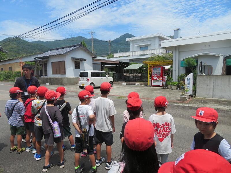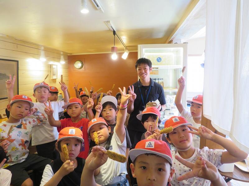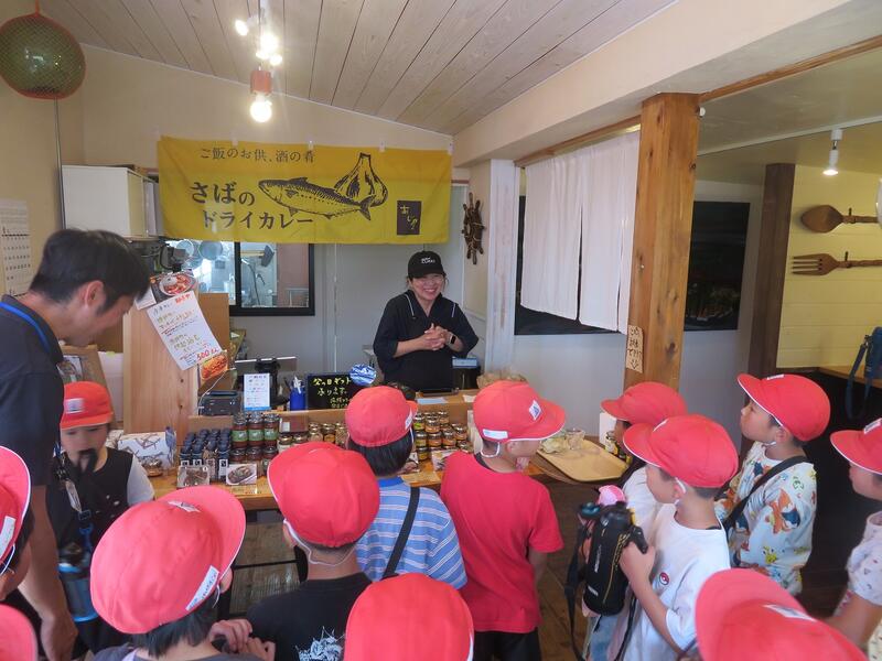 途中、「あじ屋」でPTA副会長さんが中を見学させてくださいました。冷房の効いた店内で子ども達に「スパイシーいわし」をご馳走してくださいました。子ども達は大喜びでした。ありがとうございました。↓