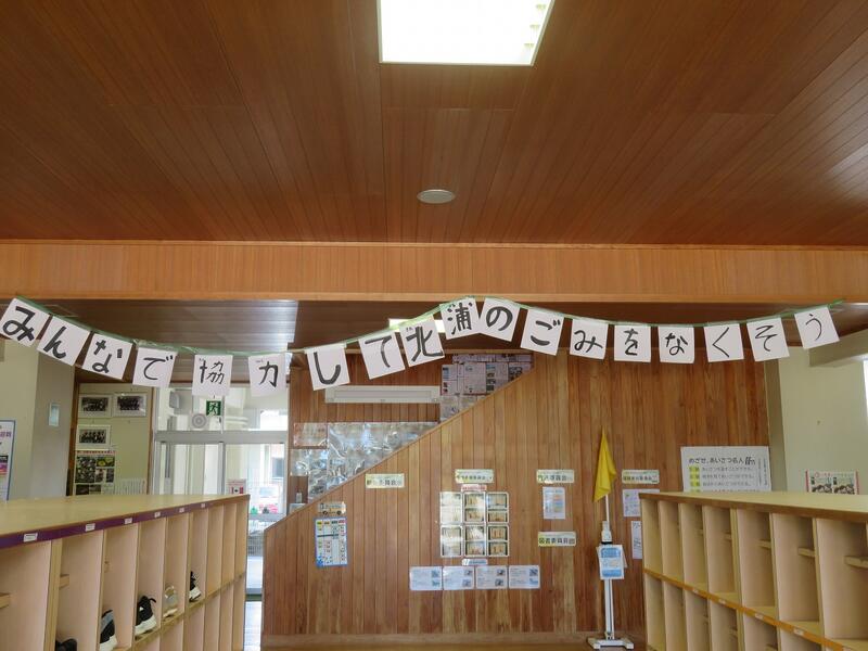 ↑児童玄関には「みんなで協力して北浦のごみをなくそう」と児童の作ったスローガンが掲示されています。