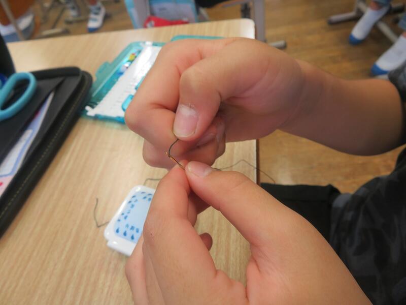今日の6時間目、5年生は家庭科「はじめてのソーイング」の学習でした。今日は ①針に糸を通すこと ②玉結びをすること この2つを学習しました。職員の丁寧な説明の後、それぞれが取り組みました。補助に入って一緒に学習したのですが(役に立ちませんでしたが…)、みんなはじめは苦労していましたが、何度もやってコツをつかみ玉結びもできました。