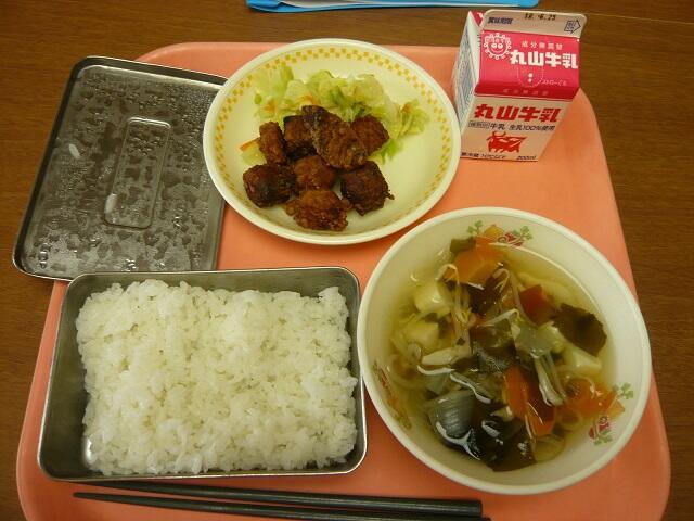 6月26日 給食 チキンチキンごぼう わかめスープ ご飯 牛乳