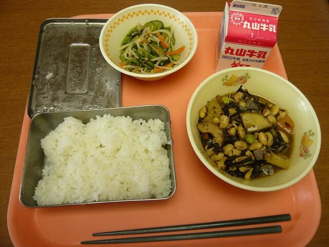 6月21日 給食 大豆の磯に 小松菜のおひたし ご飯 牛乳