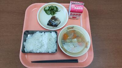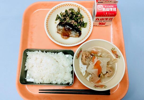 今日の献立は、牛乳、ご飯、鯖の生姜煮、昆布和え、味噌けんちん汁です。鯖の生姜煮は魚の臭みを生姜で消し、子どもたちが食べやすくしていて、白ご飯がとても進みました。けんちん汁も野菜がたくさん入っていてとてもヘルシーでした。