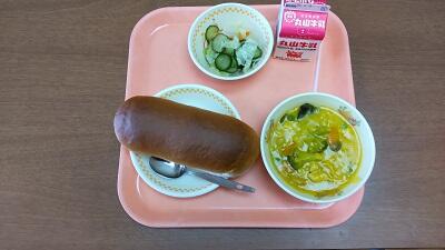 今日の献立は、牛乳、黒糖パン、カボチャのシチュー、フレンチサラダです。今日は梅雨が明けました。短い梅雨でしたが、これから暑さに負けないためにも栄養のあるものをしっかり食べてほしいと思います。そういう意味でも、かぼちゃはカロテンやビタミンB群を多く含んでいます。またカリウムには長時間の運動による痙攣も防ぐ働きもあるそうです。熱いですが残さず食べましょう。