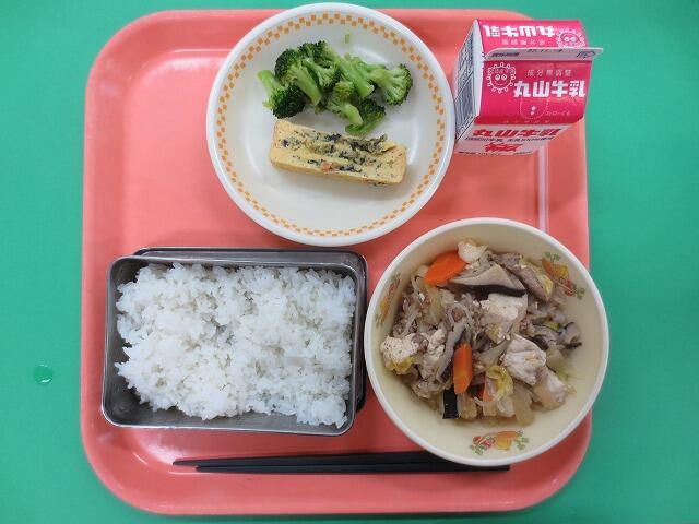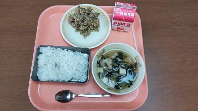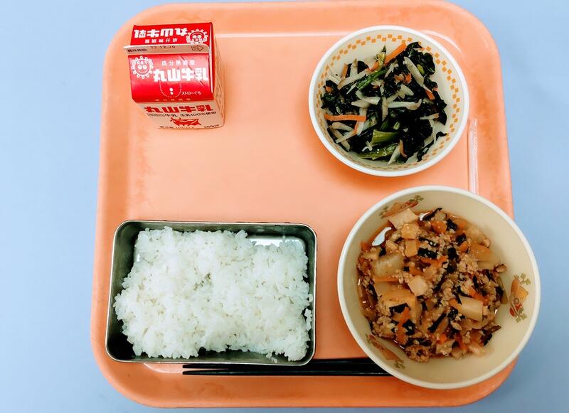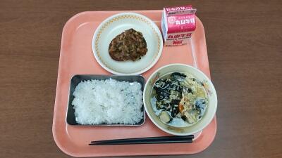 今日の献立は、ご飯、牛乳、厚揚げミートソース煮、小松菜としめじのごま和えです。