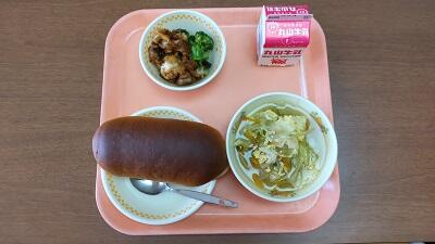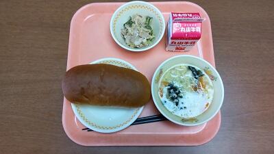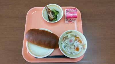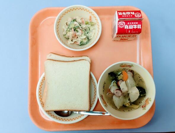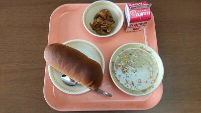 今日の献立は、ミルクパン、牛乳、フカの甘酢和え、コンソメスープです。フカの甘酢和えは、フカの身がとても柔らかく、臭みもなく甘酢の風味がきいていて、とてもおいしかったです。