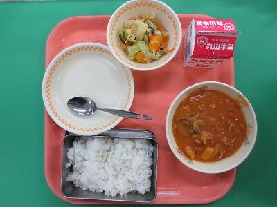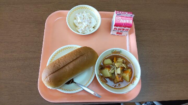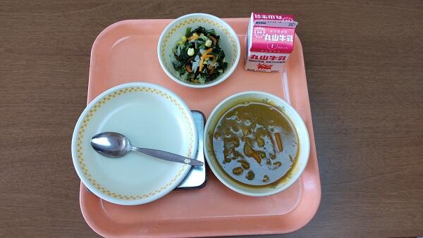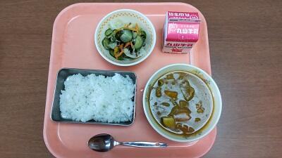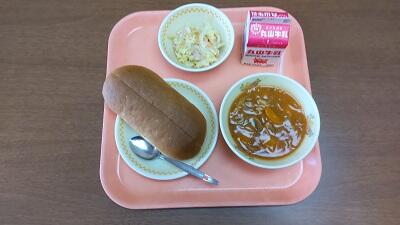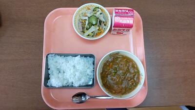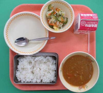 今日の献立は、カレーライス、牛乳、レンコンサラダです。子供たちが大好きなカレーライス。リンゴなどが入って、甘辛のカレーでした。カレーの時はなぜかおかわりしたくなりますね。とてもおいしかったです。