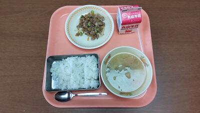 今日の献立は牛乳、ご飯、回鍋肉、わかめスープです。