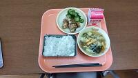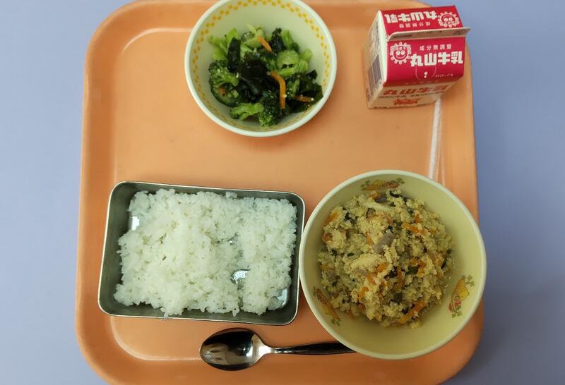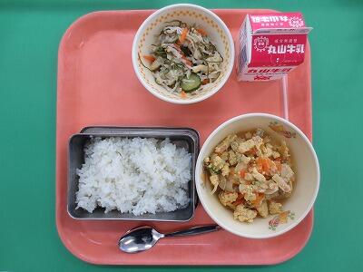 今日の献立は、卯の花丼、牛乳、酢味噌和えです。酢味噌和えはブロッコリーやわかめ、キュウリなどの野菜がたくさん入っていましたが、酢味噌で野菜がおいしく食べられました。卯の花丼も、おからや人参、鶏肉、油揚げなどがたくさん入って、少し甘めの味で子どもたちも食べやすい味付けとなっていました。とてもヘルシーなメニューでした。