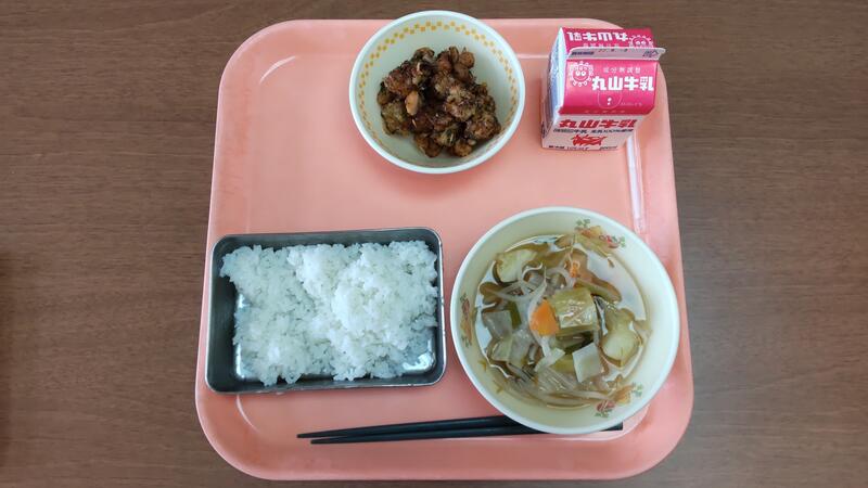 明日は市内の学校は台風で臨時休業となりますので、給食はありません。豚肉と厚揚げの炒め物が食べたかったです。