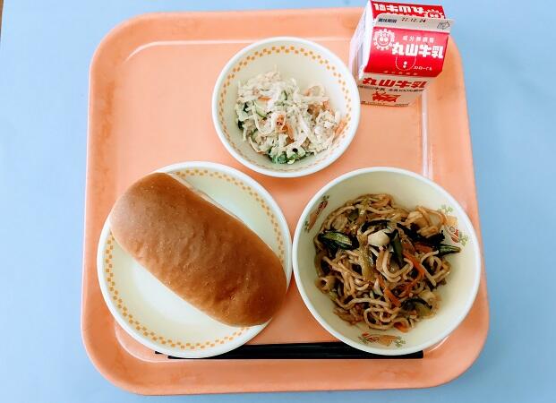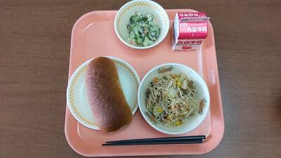 今日の献立は、減量コッペパン、牛乳、炒めビーフン、ブロッコリーサラダです。