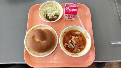 今日の献立は、チーズパン、牛乳、トマト鍋、マセドアンサラダです。マセドアンとは、フランス語で「さいの目切り」を意味しています。マセドアンサラダは材料を小さい角切りにしてマヨネーズで和えた料理です。パンに挟んで食べましたが、チーズパンによく合っておいしかったです。トマト鍋は、たくさんの野菜が入っていて、子どもたちが好んで野菜を食べられる味付けでした。