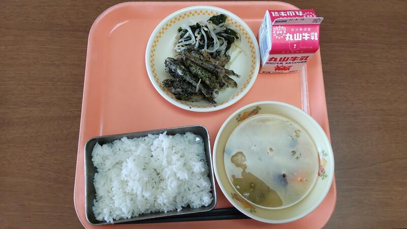 今日の献立は、ご飯、牛乳、メヒカリの磯辺揚げ、キャベツのゆかり和え、鶏ゴボウ汁です。