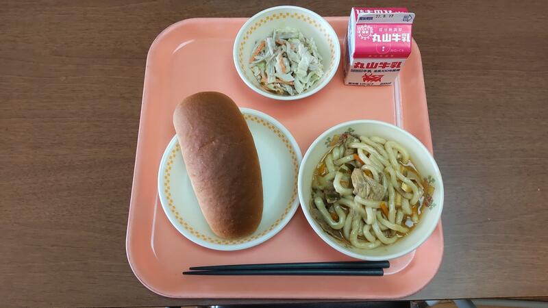 今日の献立は、牛乳、減量コッペパン、カレーうどん、かみかみゴボウサラダです。