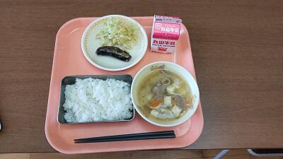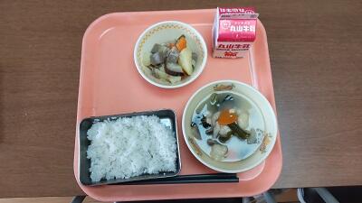 今日の献立は、ご飯、牛乳、塩肉じゃが、手作り豆腐団子汁です。