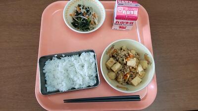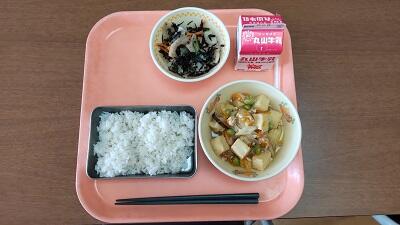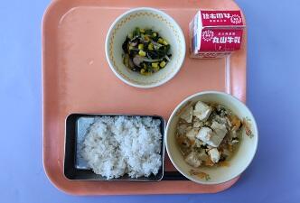 今日の献立はご飯、牛乳、厚揚げのミートソース煮、海藻サラダです。