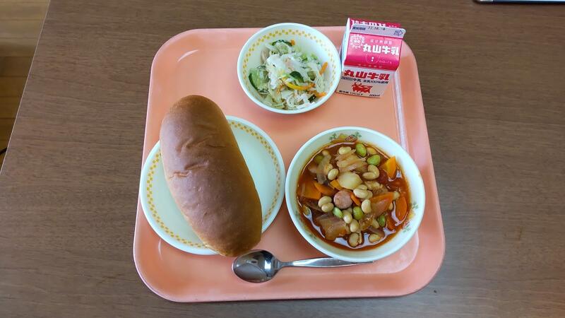今日の献立は、サラダパン、牛乳、ブラウンシチューです。サラダパンは滋賀県で生まれたメニューで、刻んだたくあんをマヨネーズで和えてコッペパンに挟んだものです。サラダパンとブラウンシチューの相性も大変よく、とてもおいしかったです。