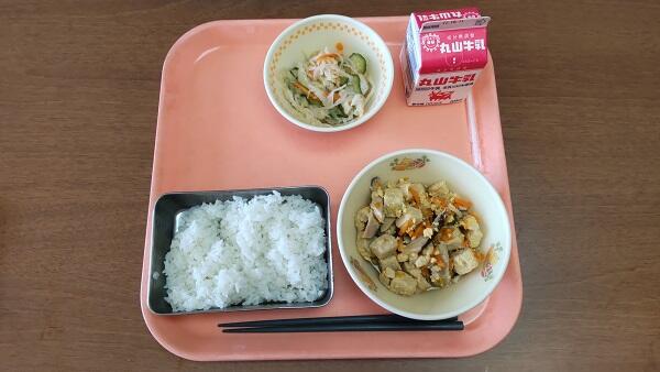 今日の献立は、ミルクパン、牛乳、豆腐のチリソース煮、ごまじゃこサラダです。