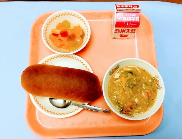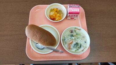 今日の献立は、コッペパン、牛乳、かぼちゃのシチュー、フルーツポンチです。