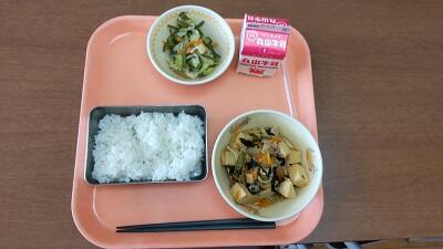 今日の献立は、ご飯、牛乳、マーボー大根、小松菜のナムルです。今日の献立は野菜たっぷりで食物繊維がたくさん取れて、腸にはいい感じのメニューです。マーボー大根も豆腐の代わりに、よく味のしみた大根がたっぷり入っていて、白ご飯にばっちり合いました。とてもおいしかったです。