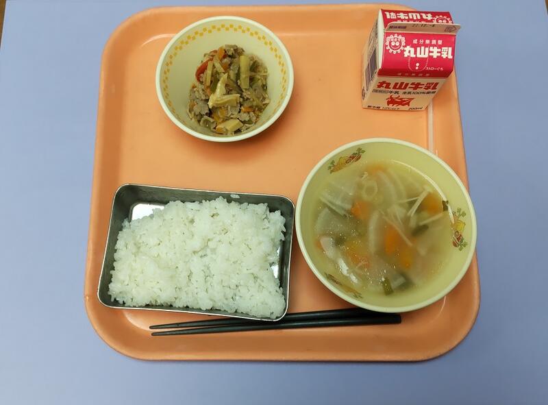 今日の献立は、ご飯、牛乳、ゴーヤチャンプルー、ゴボウ団子汁です。ゴーヤはニガウリ、ツルレイシとも言われます。ゴーヤは沖縄の伝統野菜で収穫量も多いですが、宮崎県でも多く作られています。ビタミンCが多く含まれ、苦みには食欲を高める働きもあるそうです。その言葉どおりゴーヤチャンプルーはとてもおいしく食欲が高まった気がしました。