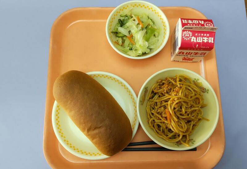 今日の献立は牛乳、コッペパン、ミートソーススパゲティ、フレンチサラダです。子どもたちの大好きなミートソーススバゲティ、麺が昔より細くなり、スパゲティという感じですし、味もにんにくやワインなどがはいっており、とてもおいしかったです。