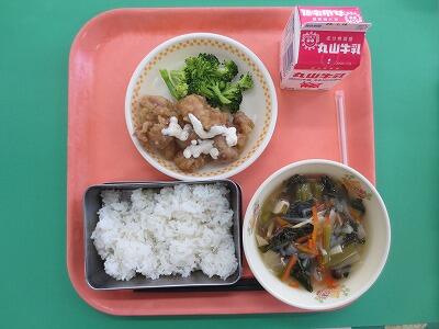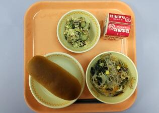 北浦近海でも捕れるメヒカリですが、子どもたちはとても大好きな魚です。今日はカリッと揚げたメヒカリにのりがかけられて、磯の香りと塩味でとてもおいしかったです。骨ごと食べられるので、成長期の子どもたちにとってはカルシウムが豊富に摂取できるのでとても体によいメニューですね。あと5cmくらい身長が伸びないかな?(笑)