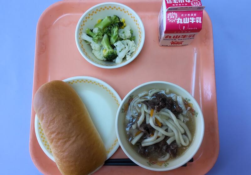 今日の献立は、減量コッペパン、牛乳、宮崎牛の肉うどん、つぼみふっくらサラダです。
