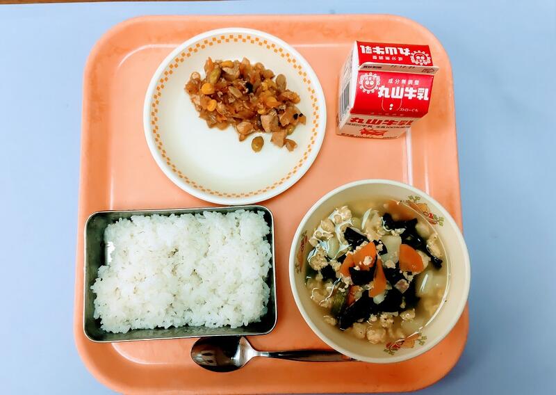 今日の献立は、ひじきの炒り煮、団子汁、牛乳、ご飯です。